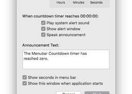 Um den Timer einzustellen, klicken Sie auf das Menüleistensymbol und wählen Sie den Menüpunkt Start .... Ein Dialogfeld wird angezeigt, in dem Sie die Countdown-Zeit in Stunden, Minuten und Sekunden angeben können. In diesem Dialogfeld können Sie auch angeben, welche der folgenden Benachrichtigungsarten Sie wünschen, wenn der Timer auf 00:00:00 Uhr abfällt: