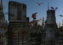3D dragons fly thru a city.